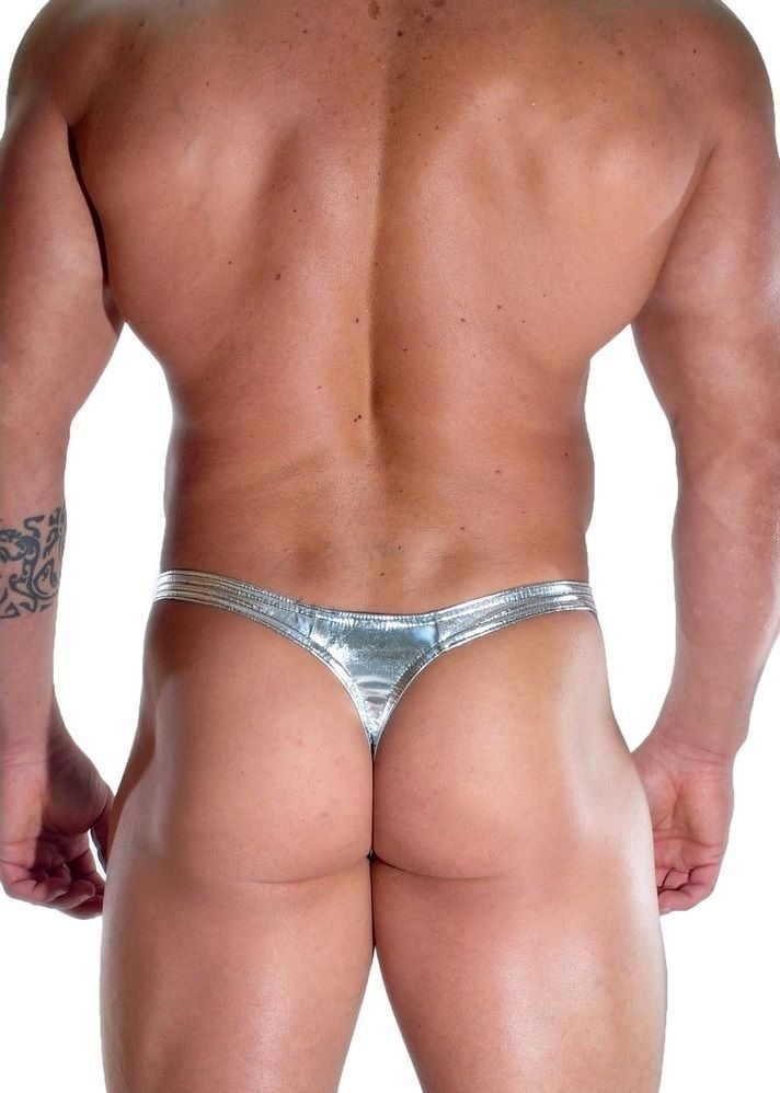 Серебристые блестящие трусы-тонги.