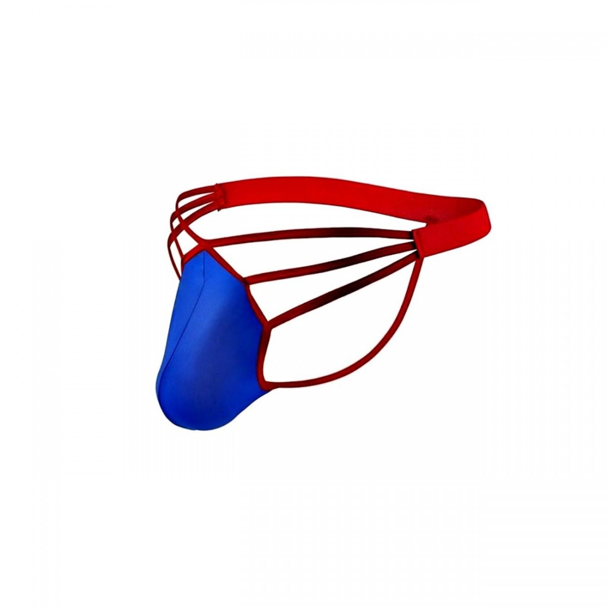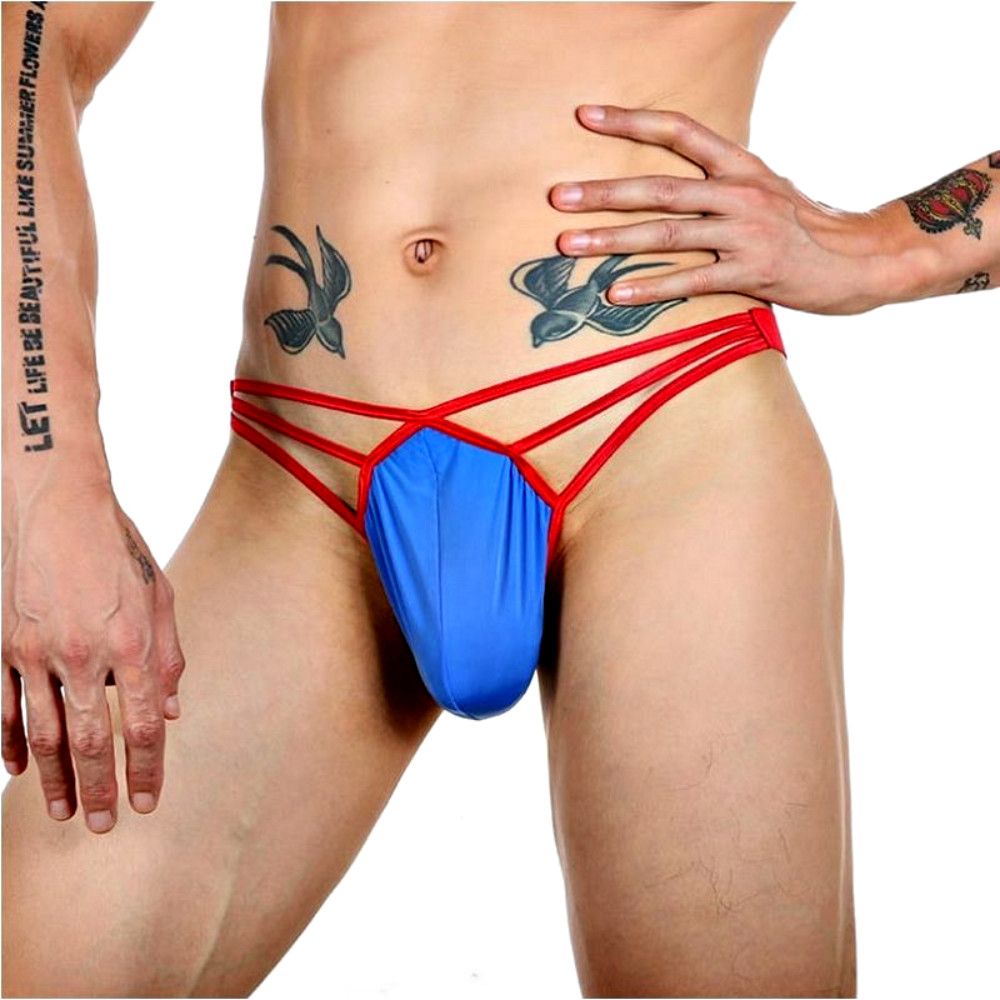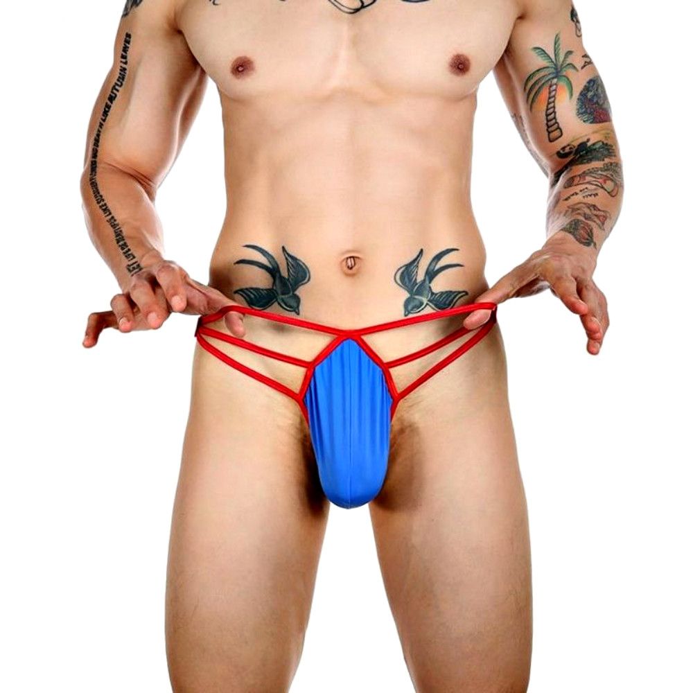 Синие сексуальные трусы-стринги на тонких красных бретелях.
