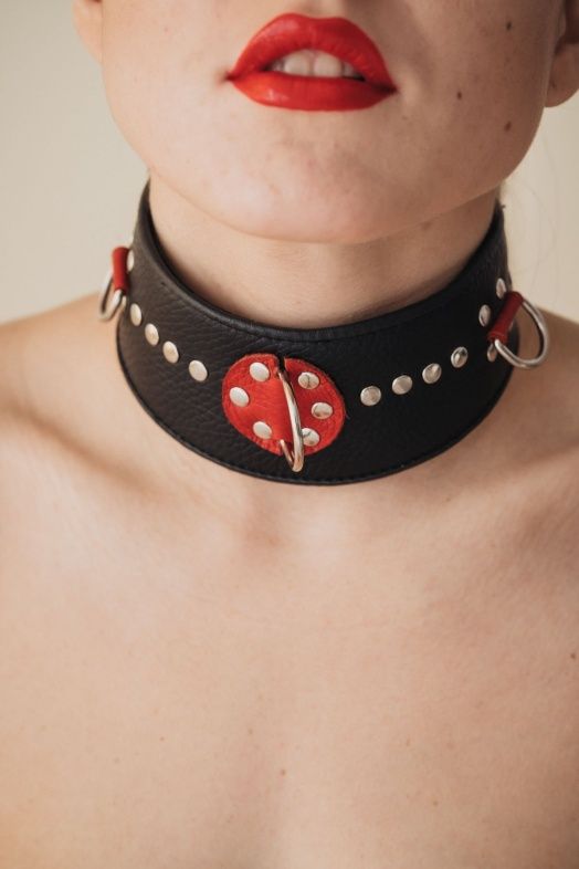 Изготовлен из натуральной кожи с металлическими заклепками. Размер универсальный. Кожаный ошейник - это один из основных атрибутов BDSM.