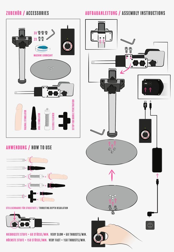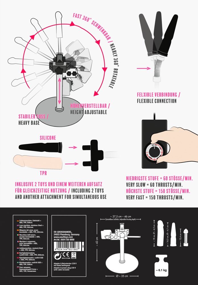 Работа в режиме свободные руки до 150 фрикций в минуту! Секс-машина с регулируемой по высоте стойкой и двумя насадками. С пультом дистанционного управления для регулирования и поворота до почти 360 градусов. Бесступенчатая регулировка достигает 150 фрикций в минуту, а глубина фрикций может регулироваться до 8 см. Предназначена для работы в режиме свободные руки и выполнена в современном дизайне. Кабель длиной 1,5 метра с штекером SchuKo типа F. В комплект поставки входит штекерное крепление для двойного проникновения. Длина вагинальной насадки - 18 см., диаметр - 4,5 см. Длина анальной насадки - 16,5 см., диаметр - 4,1 см.