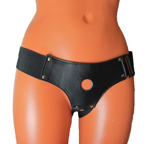 Трусики для страпона, изготовлены из кожи, имеют отверстие-доступ в области бикини. Крепятся при помощи широких эластичных лент. Размер легко меняется при помощи застежки. Диаметр отверстия для страпона - 2,5 см.