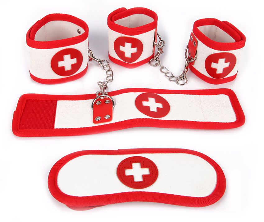 Пикантный набор, состоящий из 3 предметов для эротических ролевых игр и практик БДСМ. В комплекте: наручники, маска, оковы.