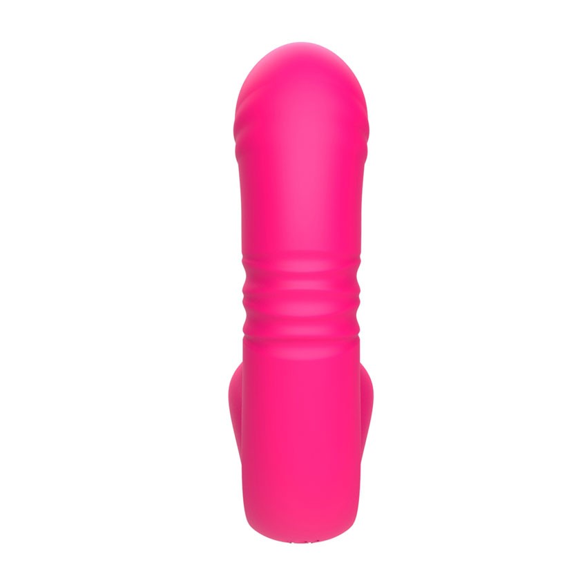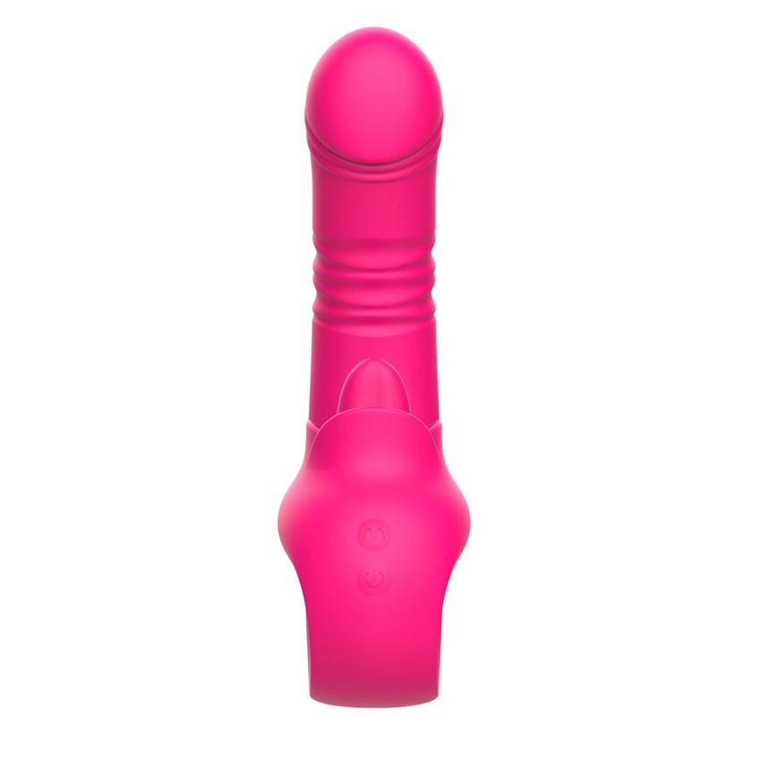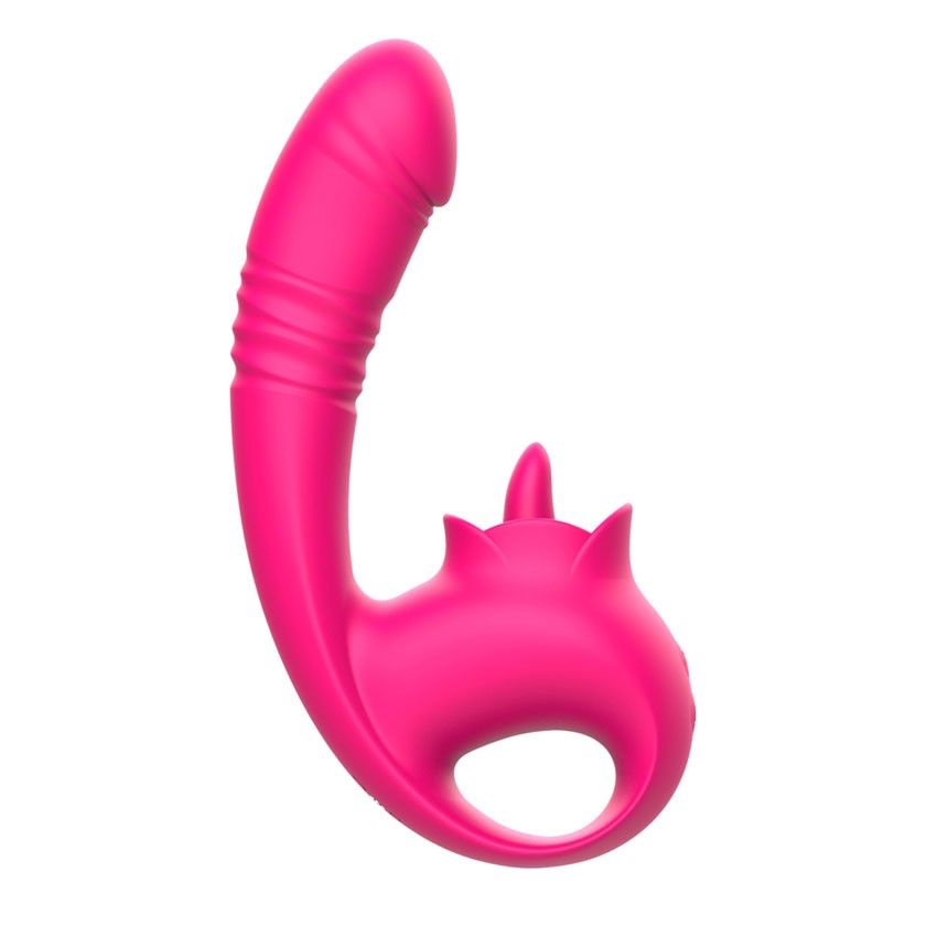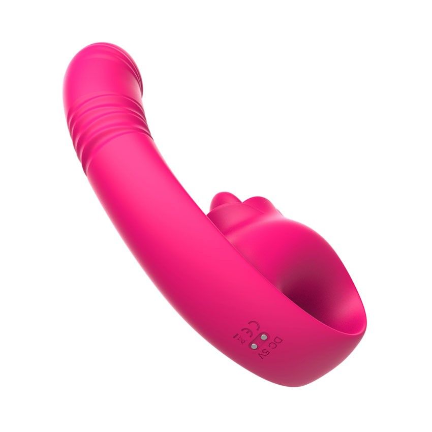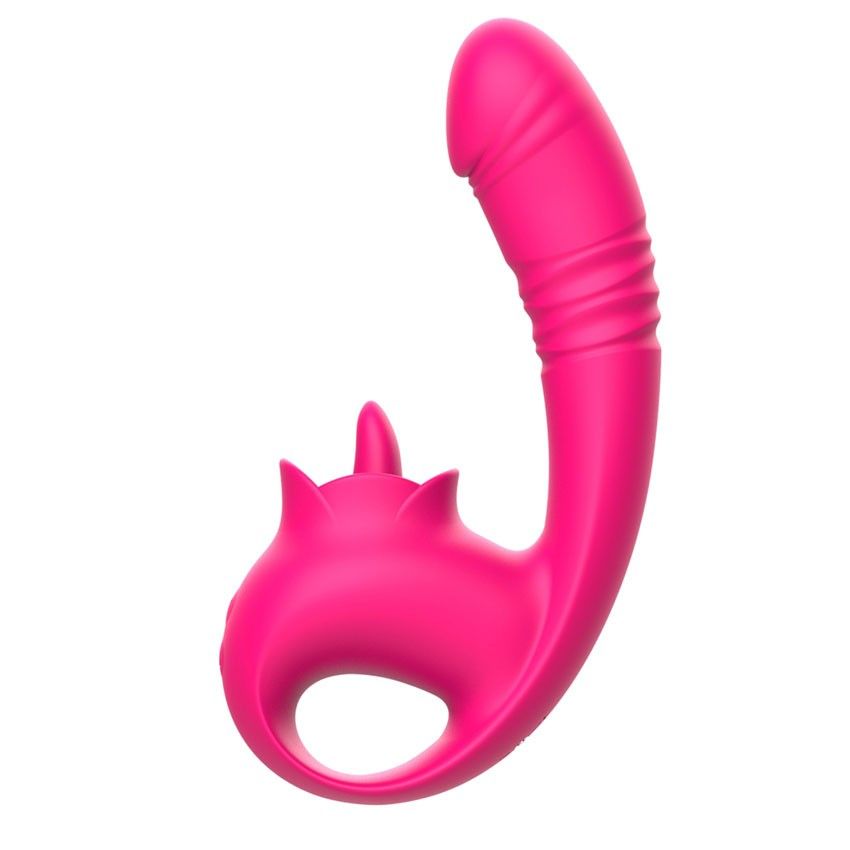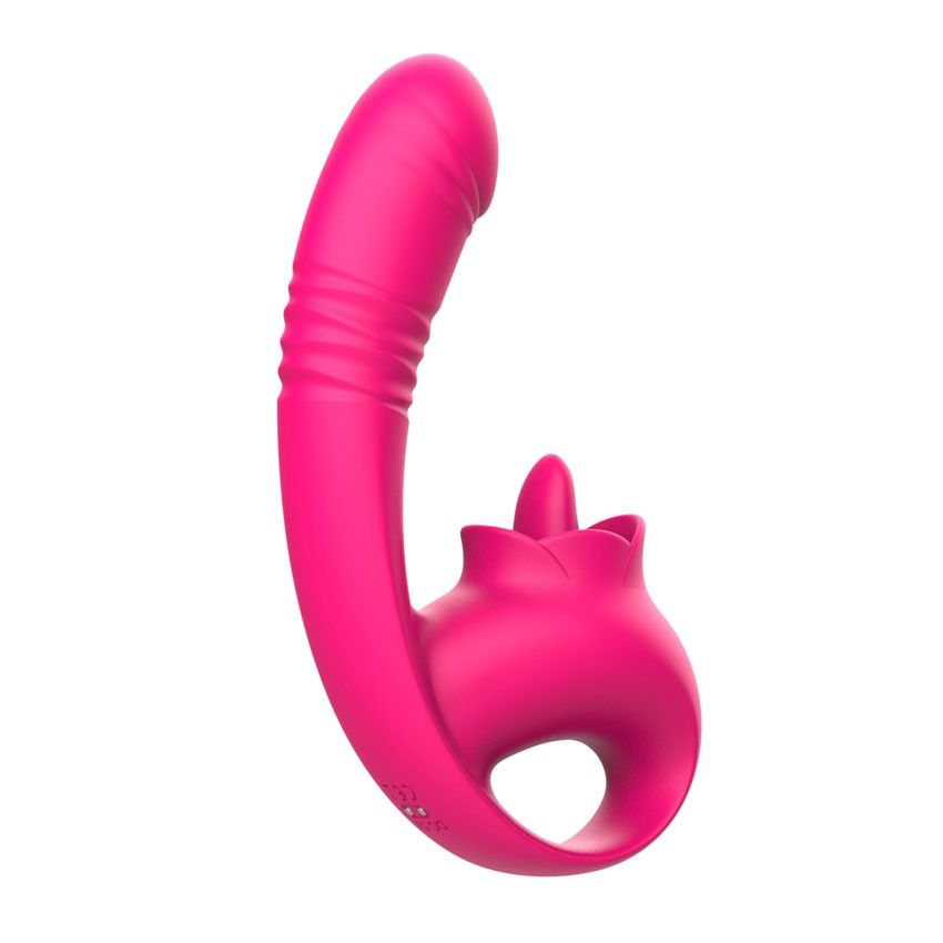 Розовый изогнутый вибратор с фрикциями. 10 режимов возвратно-поступательных движений, 10 режимов движения язычка. Рабочая длина - 13,3 см.